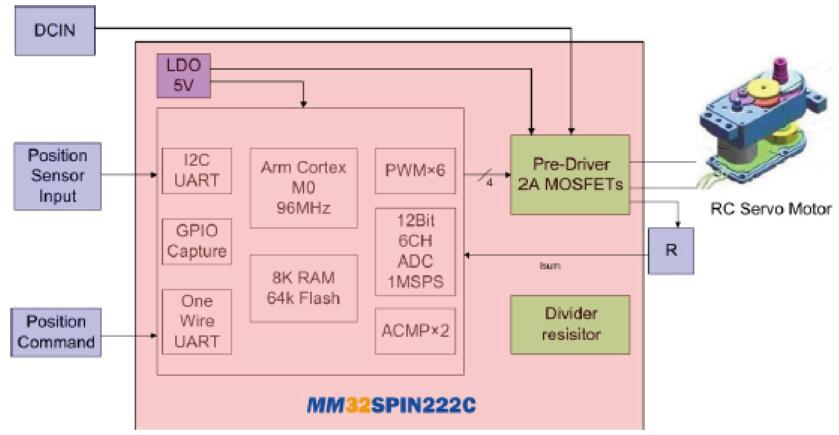 機器人舵機 | MM32SPIN222C | ● 高效率,集成度高 ● 一體化 ● 位置、速度控制 ● 保護功能:過流保護 ● 電壓范圍:5~15V |