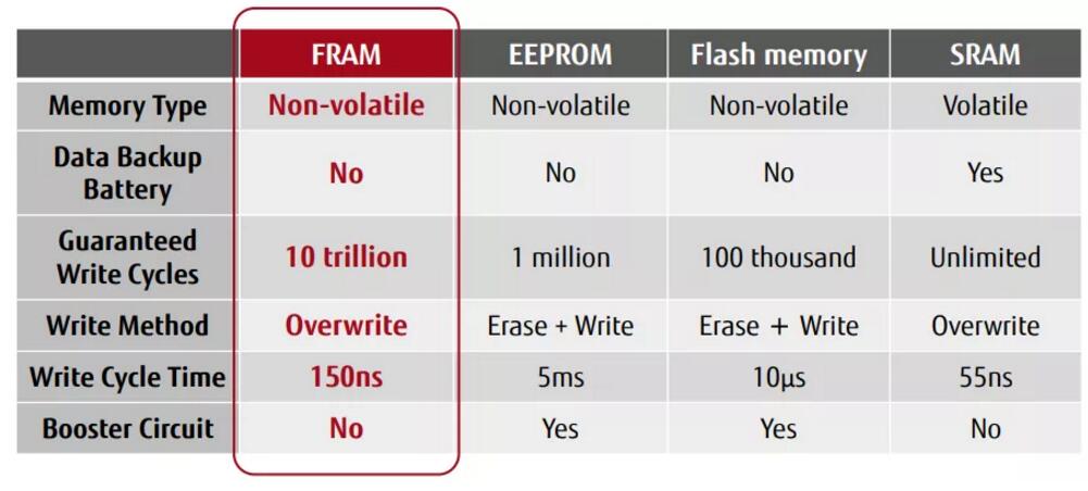 獨特性能成就技術“硬核”,FRAM是存儲界的實力派。除非易失性以外,FRAM還具備三大主要優勢:高讀寫入耐久性、高速寫入以及低功耗,這是絕大多數同類型存儲器無法比擬的。