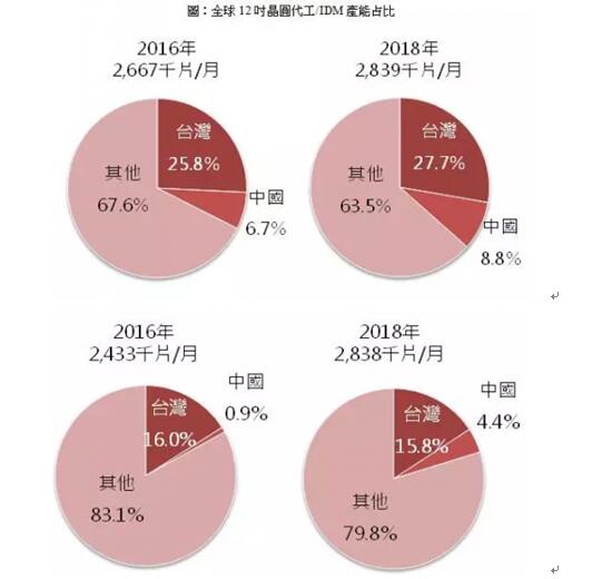 因此2018年中國企業規劃的新增產能目標將可能難以實現,預期下修到7.2萬片,其中中國廠商的先進制程(28nm含以下)產能約1.2萬片,占新增產能近17%,預計2018年中國自主非存儲器產能將占全球非存儲器產能比重約6.7%。