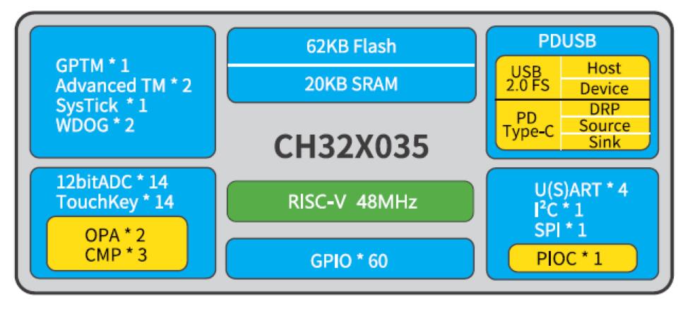 CH32X035系列是基于青稞V4C內核設計的工業級微控制器。內置USB和PD PHY,支持USB Host主機和USBDevice設備功能、PDUSB及Type-C快充功能,內置可編程協議I/O控制器,提供OPA運放、CMP電壓比較器、USART串口、/2C、SPI、定時器、12位ADC、Touchkey等豐富外設資源。