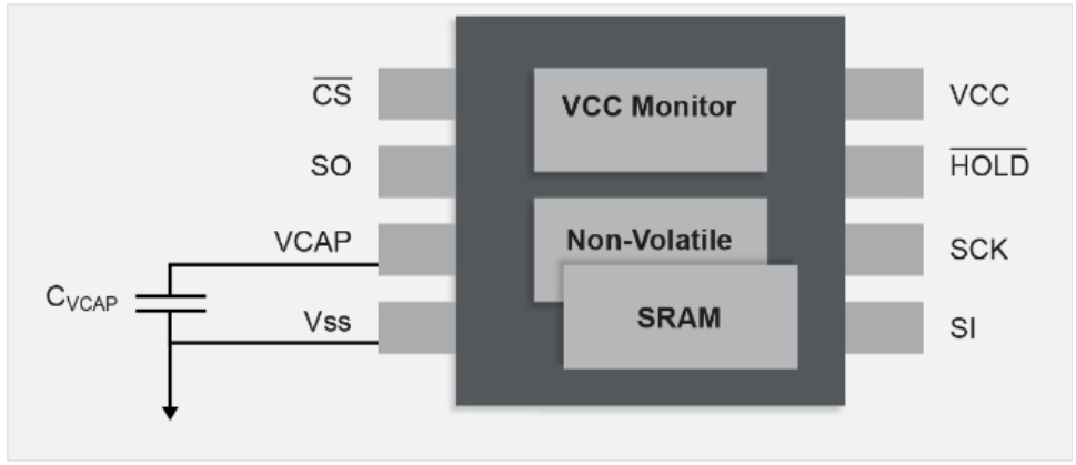 串行SRAM,在器件內(nèi)部的每個(gè)單元中都包含非易失性晶體管。與NVSRAM不同,它不需要外部電池。它使用一個(gè)小的外部電容器來提供當(dāng)系統(tǒng)斷電時(shí)將SRAM的內(nèi)容移動到非易失性單元所需的能量,這是通過IC監(jiān)視公共集電極上的電壓并自動處理SRAM和SRAM之間的數(shù)據(jù)移動來實(shí)現(xiàn)的。必要時(shí)使用非易失性存儲器。