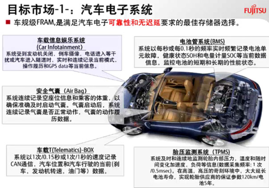 富士通FRAM早已能適用如汽車安全氣囊數(shù)據(jù)信息存儲(Airbag)、安全事故數(shù)據(jù)信息記錄軟件(EDR)、充電電池智能管理系統(tǒng)(BMS)、新能源汽車全車自動控制系統(tǒng)(VCU),新能源汽車CAN小盒子(CAN-BOX)、新能源汽車載終端設備(T-BOX)、胎壓監(jiān)測裝置(TPMS)、車輛駕駛輔助系統(tǒng)軟件(ADAS)及導航欄與信息內(nèi)容車載多媒體(infotainment)等運用中的即時且不斷的數(shù)據(jù)信息存儲,所以能減少系統(tǒng)軟件復雜性并提升數(shù)據(jù)庫安全,。