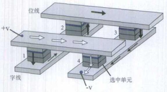 圖4給出由4個(gè)MRAM單元組成的刪格,在一條位線和一條字線加上電壓后,由圖可見(jiàn)被選中的是4號(hào)MRAM單元,這時(shí)電流從‘+V’電極流至‘-V’電極可以有兩條通道。