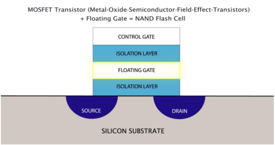 閃存單元由修改的場效應晶體管(FET)組成,在控制柵極和通道之間的絕緣層中具有額外的“浮置”柵極。通過施加高壓將電荷注入到浮柵上(或從浮柵上去除)。這會改變打開晶體管所需的柵極電壓,該電壓代表存儲在單元中的值。這些單元的陣列構成一個塊,整個存儲器由多個塊組成。