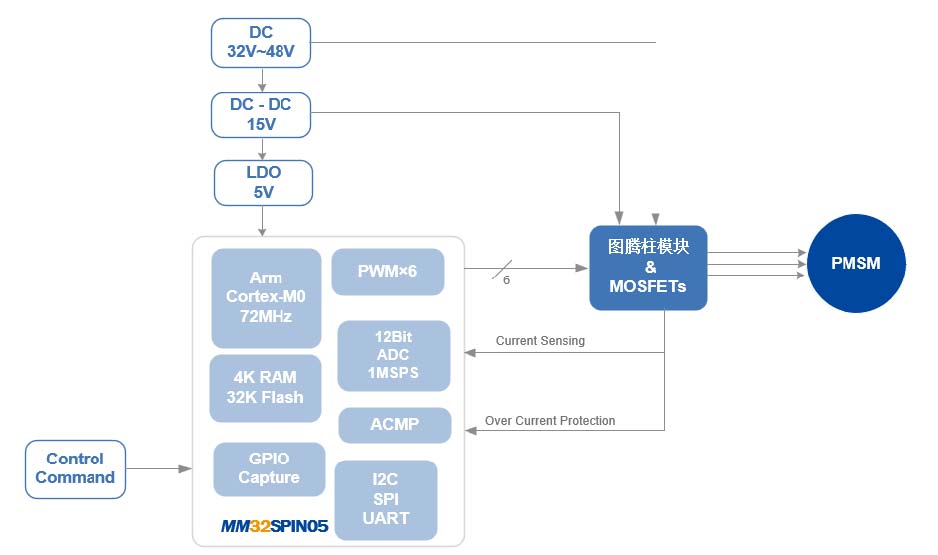 MM32SPIN080C是靈動MindSPIN旗下高性能的單電機(jī)控制SOC產(chǎn)品,采用Cortex-M0內(nèi)核,集成了運(yùn)動控制所需的專用模擬外設(shè),包括12位高精度ADC、2路模擬比較器COMP、2路運(yùn)算放大器OPAMP、三相N溝道柵極驅(qū)動器,另配備有MC-TIM、硬件除法器HW-Div、DMA控制器等專用資源,以及32KB Flash、4KB SRAM、20個GPIO等基礎(chǔ)資源。