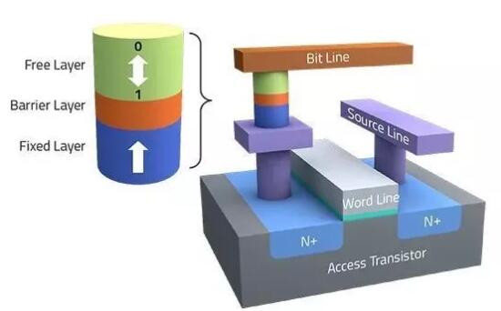 STT-MRAM是具有磁隧道結(MTJ)存儲器單元的單晶體管架構。它利用電子自旋的磁性在芯片中提供非揮發性特性。寫入和讀取功能在MTJ單元中共享相同的并行路徑。