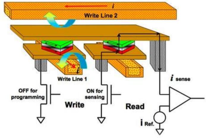 MRAM可以提供非常長的數據保留時間(+20年)和無限的耐用性。切換磁極化(Write Cycle)是在電磁隧道結(MTJ)上方和下方的導線中產生脈沖電流的結果(見圖1)。