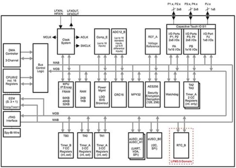 TI的MSP430FR5969是該公司低功耗MCU具有實質性芯片FRAM存儲(圖2)。在主動模式下,