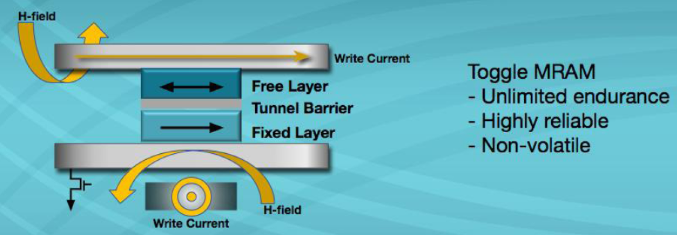 MRAM或磁性隨機存取存儲器使用具有鐵磁性材料的磁性“狀態”的1晶體管–1磁性隧道結(1T-1MTJ)體系結構作為數據存儲元素。由于MRAM使用磁性狀態進行存儲(而不是隨時間推移而“泄漏”的電荷),因此MRAM提供了相當長的數據保留時間(+20年)和無限的耐用性。切換磁極化(寫入周期)是在電磁隧道結(MTJ)上方和下方的導線中產生脈沖電流的結果(見圖1)。電流脈沖產生的相關H場改變了鐵磁材料自由層的極化,這種磁開關不需要原子或電子的位移,這意味著沒有與MRAM相關的磨損機制。自由層相對于固定層的磁矩改變了MTJ的阻抗(見圖2)。阻抗的這種變化表示數據的狀態(“1”或“0”)。通過測量MTJ的阻抗來實現傳感(讀取周期)(圖3)。MRAM器件中的讀取周期是非破壞性的,并且相對較快(35ns)。讀取操作是通過在MTJ兩端施加非常低的電壓來完成的,從而在部件壽命內支持無限的操作。