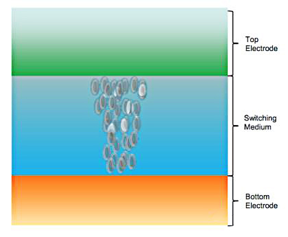 OxRAM 和 CBRAM 都是二端器件——由一個頂部電極和一個底部電極組成。在兩個電極之間是開關(guān)介質(zhì)。