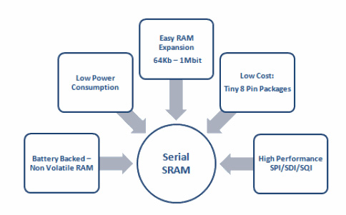 串行SRAM為向應(yīng)用添加RAM提供了一種簡單低成本的方式,這些器件采用8引腳的封裝并同時有SPI接口,可以在設(shè)計中提供更多靈活性,串行NVSRAM器件提供了低成本的非易失性SRAM或者FRAM存儲解決方案,串行NVSRAM除了有低功耗的設(shè)計還支持對存儲陣列執(zhí)行無限次瞬時寫入操作,并且斷電時可以通過外部電池自動備份存儲數(shù)據(jù)。