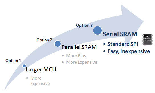 3. 串行SRAM現(xiàn)在支持向設(shè)計中靈活添加RAM,而不會帶來大型單片機或并行RAM的缺點,它使用簡單的4引腳SPI接口。 SDI和SQI接口可將數(shù)據(jù)速率提高4倍,這些器件還會通過這兩個接口來提升性能。