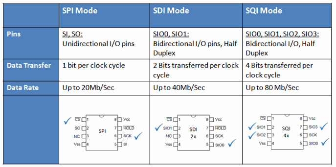 SQI模式下,全部4個引腳(引腳2、4、5和7)均配置為可隨時高效進行讀或?qū)懖僮鳎_保在一個時鐘周期內(nèi)通過總線傳輸4位,這實際上會獲得4倍數(shù)據(jù)速率。例如,標準SPI模式下需花費40個時鐘周期才能完成的任務(wù)現(xiàn)在可以在40/4 = 10個時鐘周期內(nèi)完成。 需要快速傳輸大量數(shù)據(jù)時,該功能十分有用。
