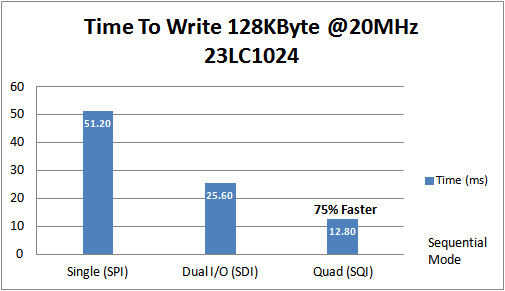 下圖給出了在SPI、SDI和SQI模式下以20 MHz向23LC1024 1 Mb SPI SRAM寫入128 KB存儲內(nèi)容所需的時間。 從中可看出,SQI比標準SPI快75%。