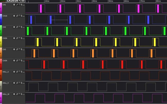 每次PWM換相后都會持續輸出一段有效電平,等到電流恢復后PWM波形恢復正常。